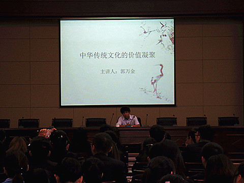讲座伊始,郭教授以身体健康是个人的基本价值为切入点,说明了人生价值是无形的这一观点,从而引出文化价值的重要性。随后他以传统文化的形成为主线,详细地阐述了传统文化的起源、轴心时代,以及变化与发展。其中他在谈到传统文化的轴心时代时表示,后来一切文明基本都在轴心时代凝结。着重强调了轴心时代对于文化传承的重要性。郭教授还谈到了一个历史的错误,那就是“打倒孔家店”这句标语并不是胡适先生提出的。胡适先生曾提出的是:“打孔家店。”一字之差,程度却大不相同。借此小故事,郭教授教育我们要正视文化,尤其是正确面对孔子的思想。讲座上,郭教授用简单明了、生动有趣的故事向我们阐述了博大精深的中华文明,使得在场同学受益匪浅。