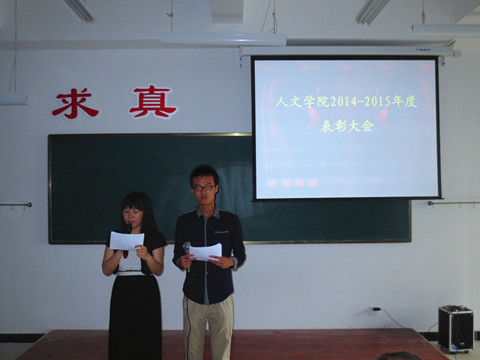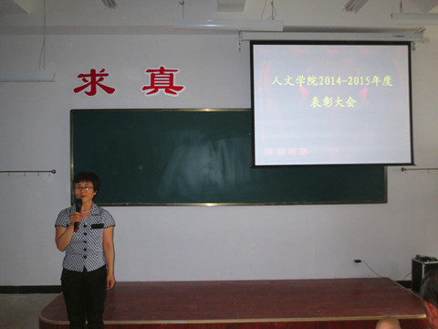 大会开始前,主持人对同学们在过去一年参加的各项活动做了简要总结,接着宣布表彰大会正式开始。大会伊始,院长李俊教授被邀请为本次大会发言。她代表学院向受表彰的同学表示热烈祝贺,向辛勤培育学生的各位老师表示诚挚的感谢。她指出,近2年来,在全校师生的共同努力下,我院的各项事业取得了长足发展,学院的核心竞争力和综合实力持续增强,本次表彰大会不仅是为了祝贺2014-2015学年在学院组织的各个活动中有突出贡献的同学,更是对未获奖的同学的鼓励。此外,她还回顾了在过去的一两年间,同学们为人文学院所付出的努力与汗水,希望同学们在接下来的时间里能充分利用大学生活,学会学习,思考人生的道路,走出课堂参加课外活动,并祝愿大家在未来的日子走得更好。接着,开始大家期待已久的表彰仪式。本次表彰有四项内容,分别是人文学院“阅读之星”优秀作品奖、人文学院院徽院训设计大赛最佳创意奖、校园活动优秀组织奖和创新创业策划大奖。随着主持人宣布的获奖名单,各获奖同学纷纷上台领奖并与颁奖老师合影留念,台下的同学也用热烈的掌声对获得奖励的同学表示祝贺。颁奖结束后,由获奖学生代表杜欣宏发表讲话,他提议同学们把掌声送给自己,并叙述了在学院的一路经历,从运动会到最后的“智者为王”人文学子积极进取,奋勇争先,有着不平凡的经历。今天我以人文学院为傲,明天人文学院以我为傲。最后,主持人再次做总结。在同学们的掌声中,此次表彰大会落下帷幕。