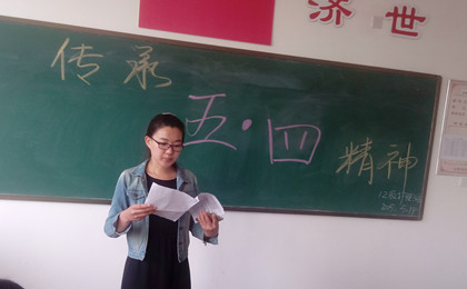 为了贯彻党的十八大报告精神,引导同学们树立正确的世界观、人生观、价值观,激励广大青年团员继承和弘扬共青团的光荣传统,增强同学们的凝聚力和历史使命感,2015年5月19日晚7时,12级护理3班在护理大楼206教室召开了以“传承五四薪火,展现青春风采”为主题的团日活动。此次班会由团支书孙雅琪主持召开。
