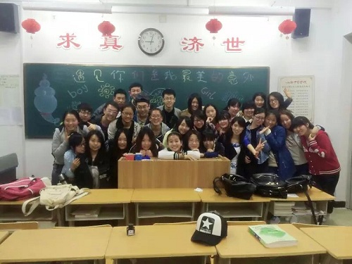 一首同桌的你让我们进入了回忆的开始,伴着同桌的你第一个团小组讲述了了我们三年以来的点点滴滴~第一年对大学的憧憬,第一次见到大学同学说不完的话,第一次期末考试的紧张。第二年熟悉的彼此,讲不完的笑话,打不完的游戏,第三年我们像一家人的继续适应新环境,这样的话语勾起了我们每个人内心深处的回忆。第二个团小组是男生,第一次和我们一起分享了他们的日常生活,他们的第一次一起出去旅行,然后每个人都说了说自己的感受,有人说自己第一次遇到这样一个特殊的班级体,第一次感受到了深厚的友谊,甚至有些人放假回家就会开始思念在学校的日子,想念自学校的我们,最后以喜平的一首仓颉嘉措的诗结束了第二个小组的回顾。“你见或不见我就在那里不悲不喜。你念,或者不念我情就在那里不来不去。你爱或者不爱我爱就在那里不增不减你跟,或者不跟我。,我的手在你手里不舍不弃。来我怀里或让我住进你的心里默然相爱寂静欢喜。”而现在的我们住进了每一个人的心理, 第三个团小组和我们一起回忆朋友的情谊,一首朋友。“这些年一个人风也过雨也走有过泪有过错还记得坚持甚么,真爱过才会懂会寂寞会回首,终有你终有梦在心中,朋友不曾孤单过,一声朋友你会懂还有伤还有痛还要走还有我这些年一个人风也过雨也走有过泪有过错,还记得坚持甚么真爱过才会懂会寂寞会回首终有梦终有你在心中,朋友一生一起走那些日子不再有,一句话一辈子一生情一杯酒朋友不曾孤单过一声朋友你会懂还有伤还有痛还要走还有我,朋友一生一起走那些日子不再有一句话一辈子一生情一杯酒朋友不曾孤单过一声朋友你会懂,还有伤还有痛还要走还有我。我们三十个朋友之间相互支持走过了跌跌撞撞的前两年和以后三年,有这么多朋友的支持相信我们以后每个人都会勇往直前的向前。第四个团小组给我们带来了诗朗诵---永远的朋友。