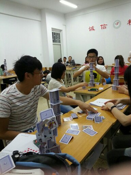活动共为四个环节,每个环节的主题分别是四个题字。第一环节中,主持人以提问形式对在场同学的大学学习情况进行了简单了解,多数同学表示自升入大学以来,对学习淡漠了很多,这也是当代大学生普遍存在的问题。由此,主持人号召大家重振学习之风。随后的环节中穿插了“搭扑克塔”的动脑环节,不同小组,不同方法,无一不将扁平的扑克牌树立了起来。