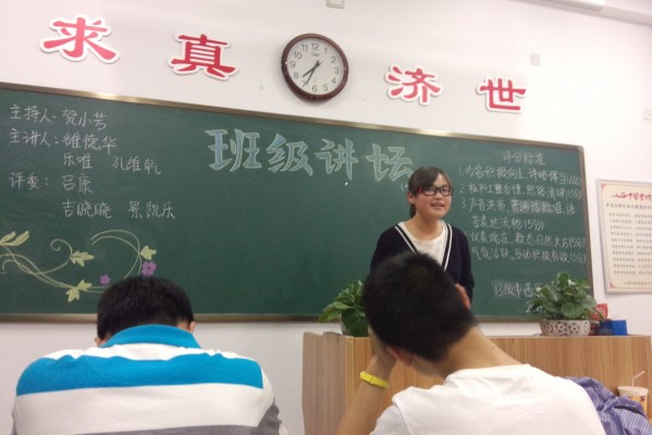在主持人贺小芳的精彩开场之后,活动拉开了序幕。乐唯作为第一个主讲人,讲述了吃水果的最好时间,分别列举了早中晚三个时间应该吃的食物。接下来,孔维乾以独特的思维讲述了”五国十代”,以及相关的整个发展历程,讲述方式新颖,运用地图讲述,生动形象,与同学们互动较好。最后,雒德华同样选取了一个比较吸引人眼球的话题——”戒指的戴法以及含义”,讲述了人的左右手各个手指戴戒指的具体含义,她的演讲给人留下了深刻的印象,气氛活跃。在三位主讲人讲述结束之后,三位评委分别对她们的表现进行点评,并指出她们讲述过程中存在的不足之处。