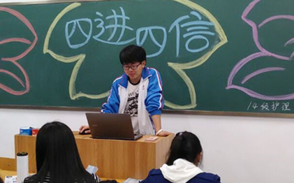 为引导广大当代大学生积极投身于中国特色社会主义建设中,增强同学们的民族自信心及民族自豪感,提高自身素质,提高政治素养,2015年4月21日晚8时,14级护理1班全体同学于新校区护理大楼302教室举行“四进四信”为主题的团日活动,班会由王慧祯主持。