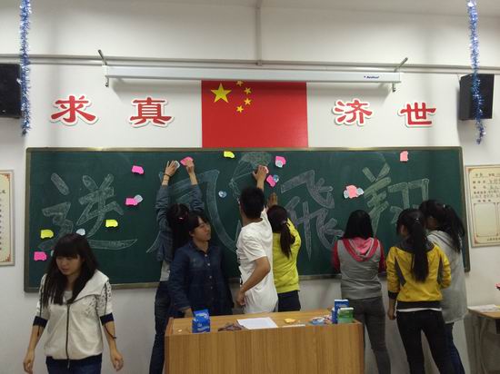 接下来三位同学朗诵了面对挫折的诗歌,从诗歌里传达正能量。班会接近尾声,同学们每人在提前分发的便利贴上写上激励自己的一段话,贴到黑板上做长期保留用以时刻勉励自己。