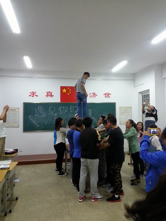 班会的高潮出现在“我相信你们”这个环节,这个游戏颇具刺激性,参与者从桌子上后倒,其余分析1班所有同学组成“人床”接着那位同学,只有真心相信他人的,才能够无虑得后倒落入同学们坚实的臂膀,而大家也只有着实珍惜这个好伙伴才能把手腕拉得更紧。游戏充分体现了分析1班同学的团结性以及彼此间的信任,连在场嘉宾也不由惊叹这个游戏。