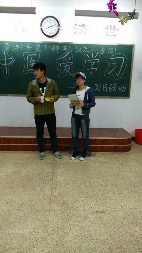 此次活动由尢晓宾,周伟等主持。活动伊始,主持人首先简单讲述了我国中医史,从春秋时期中医集大成著作的出现,到1841年鸦片战争,西方列强以坚船利炮打开中国大门,从此中国传统中医文化遭到强烈冲击,再到新中国成立,中医业得到新生,为我们描述了中医文化历经沧桑,仍屹立不倒的独特魅力。