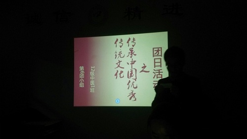 2014年12月25日,12级中医1班全体同学于医学楼307教室开展了以“中华优秀传统文化进校园”为主题的团日活动。