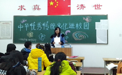 为贯彻党的十八大精神和习近平总书记讲话精神,引导广大学生继承与弘扬中华优秀传统文化,2014年12月8日晚8点,13级护理3班全体同学在仁爱书院405教室组织召开了“中华优秀传统文化进校园”主题团日活动。本次活动由齐冬雪同学主持。