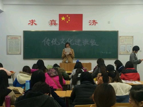 为了积极响应习近平总书记的重要讲话精神,实现伟大中国梦,加强中华优秀传统文化教育,培养学生的文化创新意识,13级护理4班全体同学于2014年12月4日20时在护理大楼403教室举行了“传统文化进班级”主题团日活动。活动由团支书刘诗琦同学主持,并特邀红十字协会理事文霞及各干事参与。