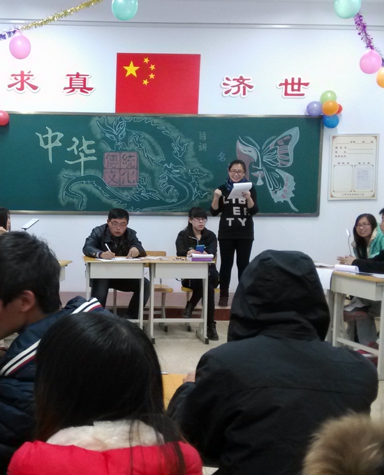 为了让大家真正了解和学习中华传统文化,并且都能参与到活动中。马静以有奖知识竞答的形式开展此次活动,活动共有三种模式:顺序问答、抢答模式以及难度提升。同学们总共被分为六个小组,每组七个人,此外还有一个主持人,一个计时员和一个记分员,每答对一道题得十分,答错一道扣五分,最终得分高的小组获胜。整个竞赛过程中同学们兴致高昂,场上气氛时而轻松时而紧张。每答对题时都会获得一阵欢呼声与掌声,在愉快的氛围中同学们学到了很多关于传统文化的知识,也收获了成就感。活动最后,马静为获胜的小组颁发了奖品,班长赵锦皓做了班会总结,鼓励大家多去了解中国传统文化,活动在欢快的气氛中结束。