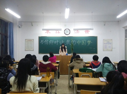 2014年11月27日,2014级中医一班全体同学在医学楼A座313教室召开“与信仰对话,我的中国梦”主题班会。在班会过程中,同学们都积极发言,畅谈自己的信仰、信念、理想。在理解中国梦的基础上,同学们讲述了如何通过自己的梦而实现中国梦。此次班会旨在使同学们树立正确的人生观价值观,引导同学们思想健康发展。