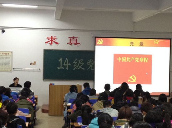 随后,庞老师强调了党的宗旨、党的纪律,尤其指出对入党人员的严格要求。为了使同学们能更正确的认识党,正确规范自己成为一名合格的党员,庞老师就“为什么大学生要积极加入共产党”、“发展党组织的程序”、“入党动机”等各方面内容进行了全面详细的解释。其中重点强调入党动机的纯洁,一名合格党员必须要有多吃苦,多奉献,多挑重担的积极思想,并坚持不懈,始终如一的坚持下去。