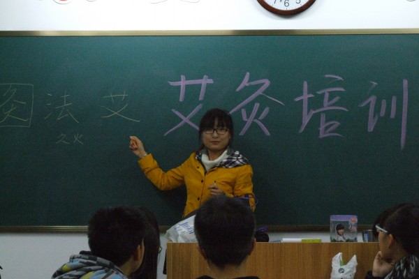 活动中,李慧还和大家分享了他的学医与行医经验,并针对常见的临床症状详细讲解了具体的应对措施,例如如何根据病人情况配穴、行针、观察疗效等。为使大家充分感受,切实学会艾灸的使用,她亲自为大家示范消毒、行针、点艾等具体操作。随后学生会成员为每个小组发放艾条,灭火容器,李慧与实践部同学耐心指导同学们的艾灸操作训练,并一再强调艾条的点火,灭火的操作要点,提醒大家注意安全。不一会儿,整个教室弥漫着艾草的味道,烟雾缭绕,但同学们都乐在其中,享受着博大精深的中医艾灸文化。至此艾灸培训圆满结束。