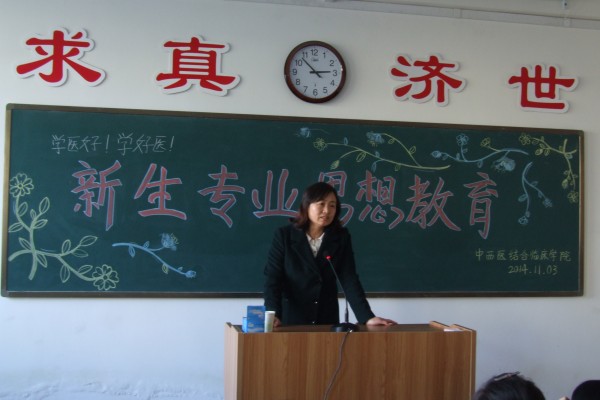 11月3日,中西医结合临床学院2014级全体新生在医学楼A座204教室举行了“求学问道系列教育讲座”之我的中医路。主讲人为副院长秦艳虹老师。