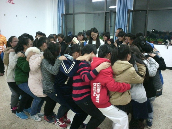 下一个游戏为“心有千千结”,这个游戏要求男女生围成一个圈,要求男女牵手,刚开始受到古代传统思想,男女有别,男女授受不亲,同学们很害羞,但我们是一个班级,牵手并不代表什么,反而代表着一种凝聚力,在后几轮中同学们放开了心里的压力。这个游戏要求同学们记住身边的人,记住要牵哪只手,否则游戏失误,解不开结,全盘皆输。这就要求同学们有指挥和接受指挥的能力,要沉着冷静,才能解开难题。