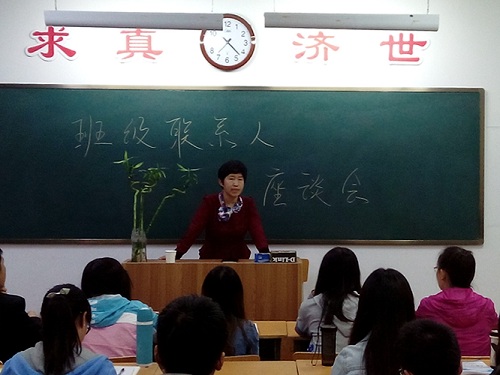 2014年10月10日李艳彦院长来到13级中医三班,与同学们亲切交流,并开展了新学期的班级联系人座谈会。