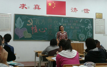 活动伊始,主持人朱沂超向同学们阐述核心价值观的内容,即倡导富强、民主、文明、和谐,倡导自由、平等、公正、法治,倡导爱国、敬业、诚信、友善,并结合本班情况在团结友善方面提出具体要求。接着,全班分为三大组对如何为核心价值观代言的问题进行讨论。随后,每组代表依次上台发表自己的看法。其中,王随艳同学说:“‘天行健,君子以自强不息’,在倡导努力实现中国梦的今天,我们要以社会主义核心价值观为基本,增强自信,奋力拼搏,发展并丰富中医梦,实现自己的理想”。她的演说获得了同学们的认可,并赢得热烈的掌声。接着,熟悉的旋律《东方红》响彻护理5班的教室,庄严神圣的歌声将本次团日活动推向高潮。最后,班长王智贤作活动总结:青年是标志时代的最灵敏的晴雨表,时代将责任赋予青年,我们要在自己所处的条件下创造机遇,谋划人生。坚持由易到难,由近及远,把核心价值观的内容作为日常的行为准则,形成自觉奉行社会主义核心价值观的信念理念,从而为学校、班级、个人创造荣誉。