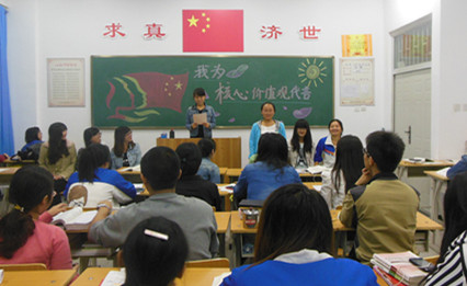 为切实引导同学们贯彻落实习近平总书记重要讲话精神,自觉将社会主义核心价值观内化于心,外化于形,2014年9月23日晚7时30分,12级护理4班全体同学在护理大楼208教室开展“我为核心价值观代言”主题团日活动。班会由团支书郭蓓蕾主持,辅导员燕鹏老师参加了此次班会。