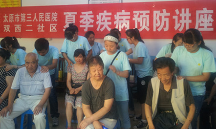 2014年7月8日, 护理学院实践队来到了太原迎泽区双西一、二社区为居民老人提供健康咨询、按摩服务。