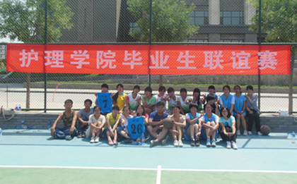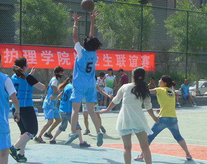 为增进护理学院同学之间的感情,促进彼此的友谊,丰富毕业生离校生活,2014年6月8日早上9点,护理学院开展的“情系六月,青春护院”毕业生联谊赛在新校区篮球场激烈上演。本次比赛共有两支代表队:一队由大三、大四同学组成的混合队,二队由大一、大二同学组成的混合队。