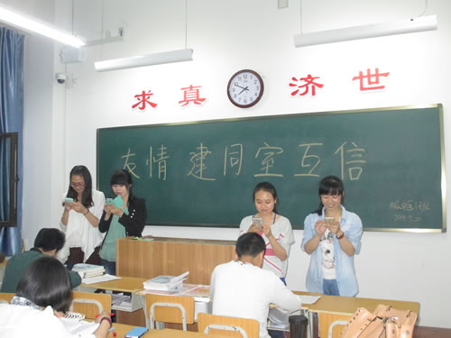 这次活动在心理委员杜文标的热烈开场白下开始了,他向同学引出了“友情·情寄所托·建同室互信”的主题,并且向同学们简述宿舍人际关系对大学生心理健康的重要影响。小小的宿舍是大学生最直接参与的人际交往场所,也是衡,关系进行深入调查研究,对大学生的人格完善和心理健康具有重要而深远的意义。这次心理主题班会以宿舍为单位进行分组参与讨论,首先男生宿舍202舍长王鹏同学通过网络收集资料,带大家了解了一些大学高校宿舍惨案,血淋淋的悲剧引起大家高度紧张,也给与我们很多教训。接着为了缓解一下紧张的气氛,几个女生宿舍表演了一些节目和讲述宿舍中的小故事,现场笑语一片,温馨满屋。尤其604宿舍女生的一首歌曲《一个像夏天,一个像秋天》唱出了宿舍交际的种种,令人感触尤深啊。在班会当中,全体同学积极参加,踊跃发言讨论,气氛热烈。最后,杜新亮同学上台发言,向同学们提出了几条有关营造良好宿舍人际交往关系的建议,把活动推向高潮。