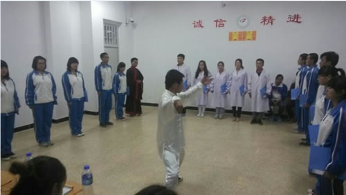 13级中医定向班在接到通知后,积极准备、精心策划,将古中医文化、阴阳鱼等融为一体,认真的诠释着我们对中医文化的认识。《中医赋》《金针赋》《医德赋》等代表了我们对中医的赞美与歌颂。《大医精诚》精华部分的朗诵在磅礴的配音下显得气势如虹,显示出我们作为中医学子对古人医德高尚的仰慕。表演时,同学们全身心投入,领悟中医文化的博大精深。