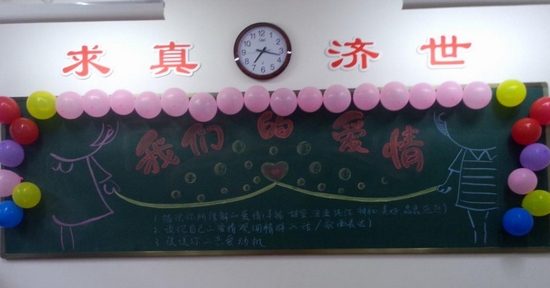 首先,同学们围绕“描绘你所理解的爱情”、“讨论自己的爱情观”和“谈论你的恋爱动机”三个问题进行交流,同学们用许多经典的爱情箴言和歌曲表达了自己对爱情的认识。随后,以“喜欢一个人应不应该表白”为辩题举行了小型辩论会,同学们热情高涨。随后,进入“表达爱”环节,同学们把自己对爱情的看法和对喜欢的人说的话写在便利贴上贴在心墙上。最后,班长赵锦皓总结了班会。