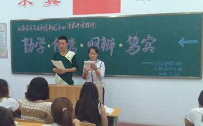 活动伊始,主持人简单陈述了此次班会活动的主题,宣读了习总书记的讲话内容,着重强调,作为青年团员的我们要以实际行动深入学习、贯彻、落实习总书记五四讲话精神,树立和培育社会主义核心价值观。接着,主持人将话题切入到“勤学•修德•明辨•笃实”这四词八字上,由同学们自由讨论。其中李佩伶说到,努力学习专业知识和提高专业技能,此谓“勤学”;尊老爱幼,尊师敬长,诚实守信,乐于助人,此谓“修德”;公私分明,爱憎分明,此谓“明辨”;坚定不移地追逐自己学医的理想,此谓“笃实”。她独特的见解,言辞准确,论点鲜明,赢得了大家的阵阵掌声。随后,由赵鑫轶和解宝卫共同朗诵了诗歌《我的中国梦》,情感恳切,慷慨激昂,句句流露出作为青年团员实现“我的梦中国梦”的决心,将班会推向高潮。之后,班会在同学们共同合唱的《我的未来不是梦》的歌声中圆满结束。最后,由辅导员燕鹏作班会总结。他指出,同学们当前最重要的是要珍惜青春时光,努力学习,勇于实践,自觉将个人梦融入中国梦之中,争做有担当,有梦想,有奋斗的新一代青年。