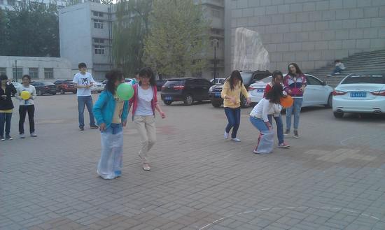 首先,文体委员曲文强同学提前为大家设计场地,待大家集合后将全班同学进行分组,五女两男七人为一组,共分为六组。接下来为大家讲述规则,分别进行袋袋蹦、协同大作战、知识问答、双人跳4个游戏。在袋袋蹦的游戏中,第四组成员赵楠,田丰等同学表现优秀以35.9秒获得了第一,而第一组齐娅汝,朱志伟同学表现不佳排名最后,接受了吹有胡椒粉气球的惩罚。协同大作战要求两人进行十米往返取球运动,要求取球方式用除手以外身体其他部位夹住气球进行往返运动。大家在此轮游戏中表现旗鼓相当,难分伯仲。知识问答游戏将团日活动推向了高潮。主持人准备了有关体育的十五道选择题,每一队分工明确,有吹球的捏破球的还有负责专业知识答题的。只听见在“开始”一声后此起彼伏的捏爆气球声,而答题过程中每队有答对的也有遗憾答错的。最后是双人跳比赛,即两人一根跳绳限时一分钟,按数目多少进行评判。而在此环节中董娇莉、韩瑞同学表现格外优秀,赢得大家一致好评。