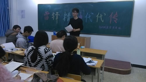 2011级中医英语班在教学楼413教室和校园里组织了以“雷锋精神代代传”为主题的团日活动,全体同学积极参与其中。本次活动旨在弘扬雷锋精神,传承中华文明。