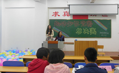 为营造良好的学习氛围,培养大学生敏捷的思辨能力,2014年4月16日晚7时30分,护理学院趣味知识竞赛决赛在护理3教室隆重举行。学生会主席成彪,副主席聂军应邀观看比赛,比赛由文艺部干事刘诗琦主持。
