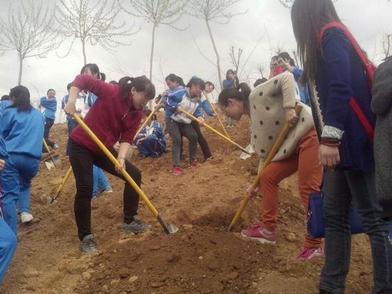 阳春三月,草长莺飞间,冬天的寒意还未褪尽,春天带着绿色的气息向我们走来,春风吹绿了枝头上的嫩芽,吹绿了地上的小草,也吹动了意气风发的大学生的热情。植树活动中,学生们热情高涨,只见他们手拿着铲子后脚蹬地,身体前倾,然后把铁铲插入土中,使出浑身解数,使劲挖出一块块泥土。学生们团结一致,轮流着挖坑。有的学生双手甚至因为铲土磨起了水泡,汗水浸湿他们的衣裳,可是他们并没有抱怨过一句,而是继续埋头苦干。