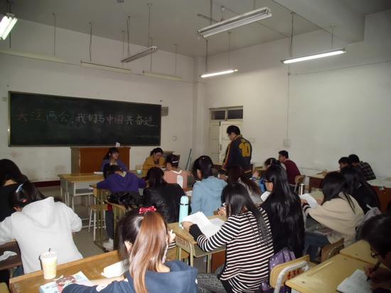 首先张欣同学介绍了两会时间及两会的基本情况。接下来同学们积极就李克强总理发表的“政府工作报告”进行了解读。岑栋斌同学就“城镇化问题”提出了自己的观点,他认为不能进行“一刀式”的大拆迁,城镇化要继续保持特色。孙陵陵同学谈到“反腐”问题,认为经费开支必须公开透明化。张娜同学就专业所学提到了“医疗”方面问题,国家加强对全科医生的培养,并提出作为中医药学子,要努力学习专业知识,将中华传统文化继承发扬光大。随后同学们都纷纷要发言。王老师作了小总结,提出科技创新、环境污染、民生保障这三个问题,并要求我们时刻严于律己。随后主持人提出问题:如果你是人大代表,对于新校区的建设你有什么建议?之后,同学们展开讨论,随后提出在新校区划出一块地让学生自己参与中草药种植、优化新校区周围的环境和缩短反馈意见的周期等等意见。王老师一一作了记录。结合时事,主持人最后谈到了昆明火车站暴徒砍人事件。大家进行了新一轮的思考。李无双同学表示痛心,要严惩暴徒的犯罪行为,他们带来了严重后果,引起社会负面情绪,导致整个民族陷入惊恐。王晋潞同学随后也表示震惊和悲伤,29个生命离我们而去,同时也感到愤怒,恐怖分子为何这样冷血、无情和疯狂?所以换位思考,我们更应该对同为普通民众的维族人民进行团结、友爱和协作,好好学习和工作,尽自己的力量去维护社会和平。