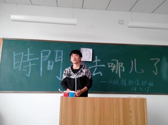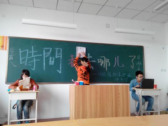 3月17日下午2时,中药学院2013级植物保护班在医学楼503教室举行了以“时间都去哪儿了”为主题的特色班会,辅导员白舒霞老师应邀出席此次班会。唐凯凯同学主持班会,37名同学全部到场参加。