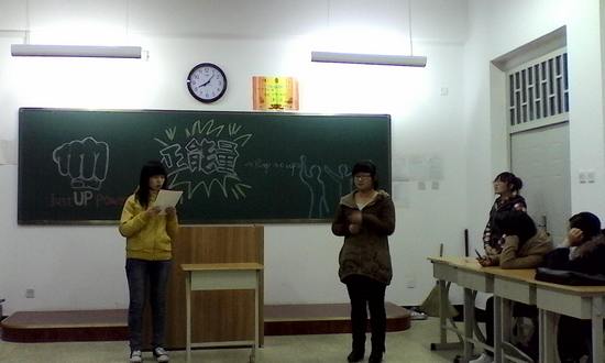 班会一开始,各班委对上学期工作做了工作总结,并谈了自己本学期的工作计划,对同学们提出了要求和期望。班长介绍了正能量的概念,并向大家推荐《正能量》一书,希望大家能够通过这本书了解正能量。李美霞、李琼两位同学带来的祈祷手语表演让同学们的心灵得到了一次洗礼,诙谐幽默的小品《严师出笨徒》让同学们开怀大笑,班会气氛十分融洽。