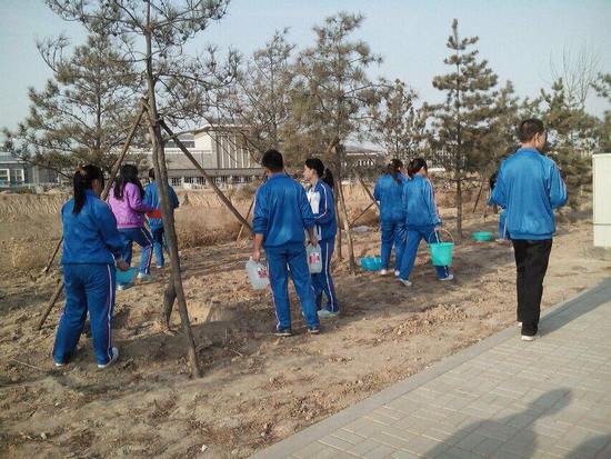 全班同学身着校服整齐的排着队列向前行进着。男生拎着装满水的桶,健步如飞,女生端着五颜六色的盆,随着步伐的行进,盆里的水漾出了水花,就好比同学们热情澎湃的心,不断激荡着。走到校东门,大家挨个走到每一棵树的旁边,浇灌枯裂的泥土,为美丽的学校,为美丽的的大自然献上自己的绵薄之力,希望这些小树苗可以茁壮成长。浇水结束,我们的活动也接近了尾声,大家一起合影留念。