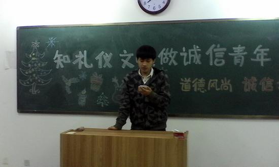 本次活动的主题为“知文明礼仪,做诚信青年”,旨在提高同学们的道德素质,增强同学们诚信考试的意识。首先,班长号召同学们要尊敬师长,礼貌待人,积极备考,诚信考试,迎接挑战。同学们受益匪浅,频频点头。最后,同学们在幽默的游戏中结束了本次活动。