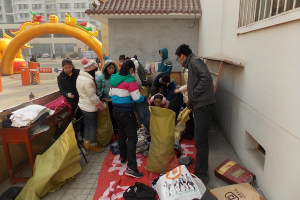 经过悬挂条幅、张贴海报、展示宣传板等准备工作之后,学生党员及积极分子耐心地给前来围观的居民进行解释工作,家属区现场募捐正式开始以后,志愿者们除了整理现场衣物之外,还要不时的协助居民从家里往外搬送衣物,虽然天气异常寒冷,但是各位志愿者已然坚守岗位,认真工作。期间赵瑞宝副书记亲临募捐现场,亲切看望值班的各位同学,并认真地指导工作。下午4点,现场募捐工作正式结束,共募得衣物600余件。