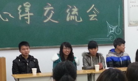 为了引导广大新生更快地接受大学的考试形式与内容、掌握考试的技巧,更好应对期末考试,2013年12月17日晚19时30分,13级涉外护理班在新校区护理大楼涉外小教室开展了学习心得交流会。学生会副秘书长杨佩伶、网络技术部部长杨成彤、原学习部干事王志芬、办公室主任张锴睿与年级学霸梅述浩作为嘉宾出席。涉外护理全体同学参加,活动由团支书邵帅主持。