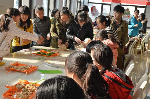 比赛过程中,各班人员仔细分工,按部就班。其中会包饺子的认真耐心的教不会的人,大家其乐融融。不一会儿,各班均是战果累累。大家手上身上也难免沾上了面粉,但是全班人员在一起动手包饺子过冬至节的喜悦都溢于言表。包饺子环节告一段落,大家都期望着饺子快点出锅,想要看一看、尝一尝自己的劳动成果。果然,虽然大家包的饺子形状千奇百怪,但是大家都吃得津津有味。