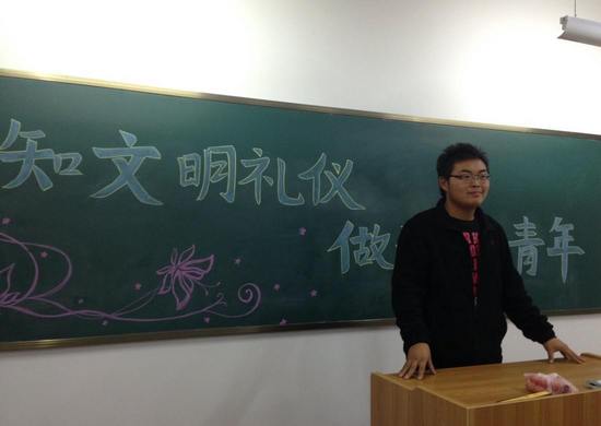 2013年12月12日晚7:30,2013级中药临床2班在医学楼216教室举行以“知文明礼仪做诚信青年”的主题班会,班会由班长主持。