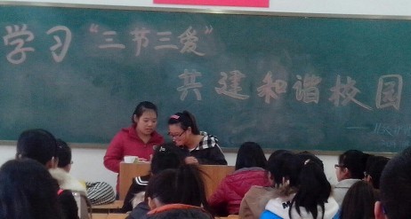 为了积极响应护理学院主题教育月活动的号召,引导广大学生树立社会主义核心价值观,2013年11月21日下午4点,11级护理3班全体同学在护理大楼302教室举行“学习三节三爱,共建和谐校园”主题班会。班会由朱琳、赵旭静同学主持。